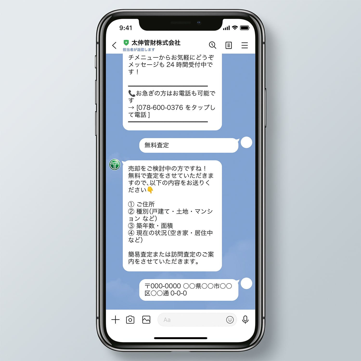 売却をご希望の場合は「無料査定」と、賃貸活用をご希望の場合は「貸したい」とご送信していただき、次に物件の物件情報をお伝えください。その他ご相談も承ります。